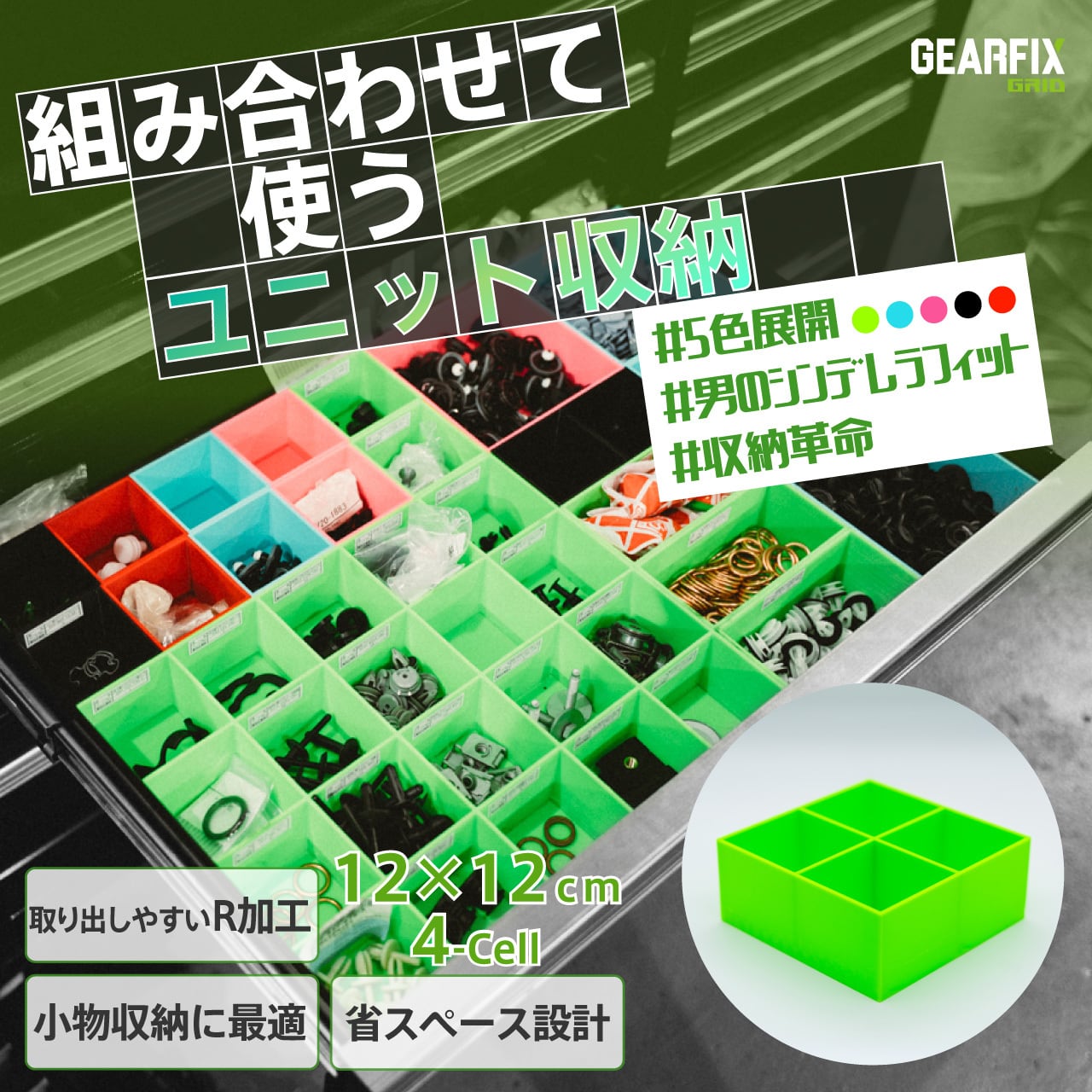 GEARFIXの中で、整備現場で多用される小物パーツ(クリップ、ヒューズ、ボルト等)に特化した収納ライン。