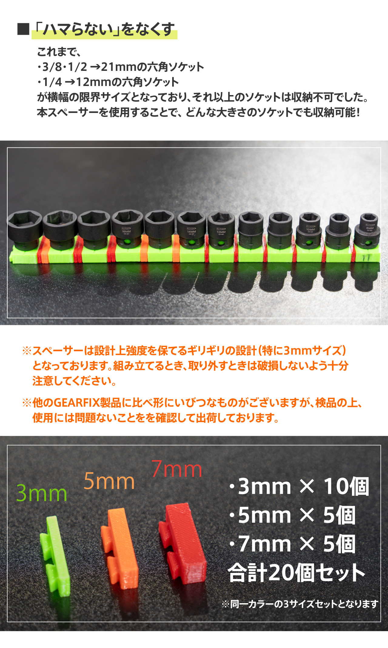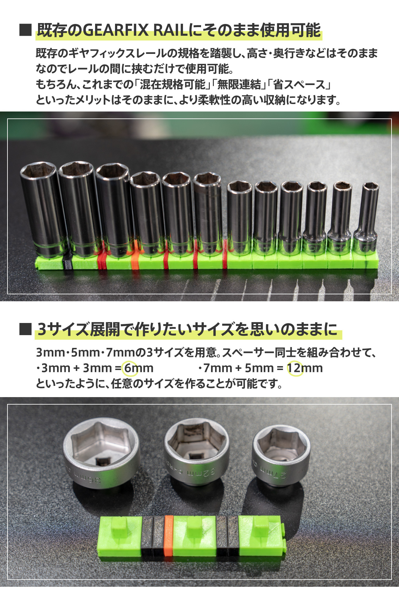 3mm,5mm,7mmのセットで、組み合わせれば1mm単位でジャストフィットなソケットレールが完成します!