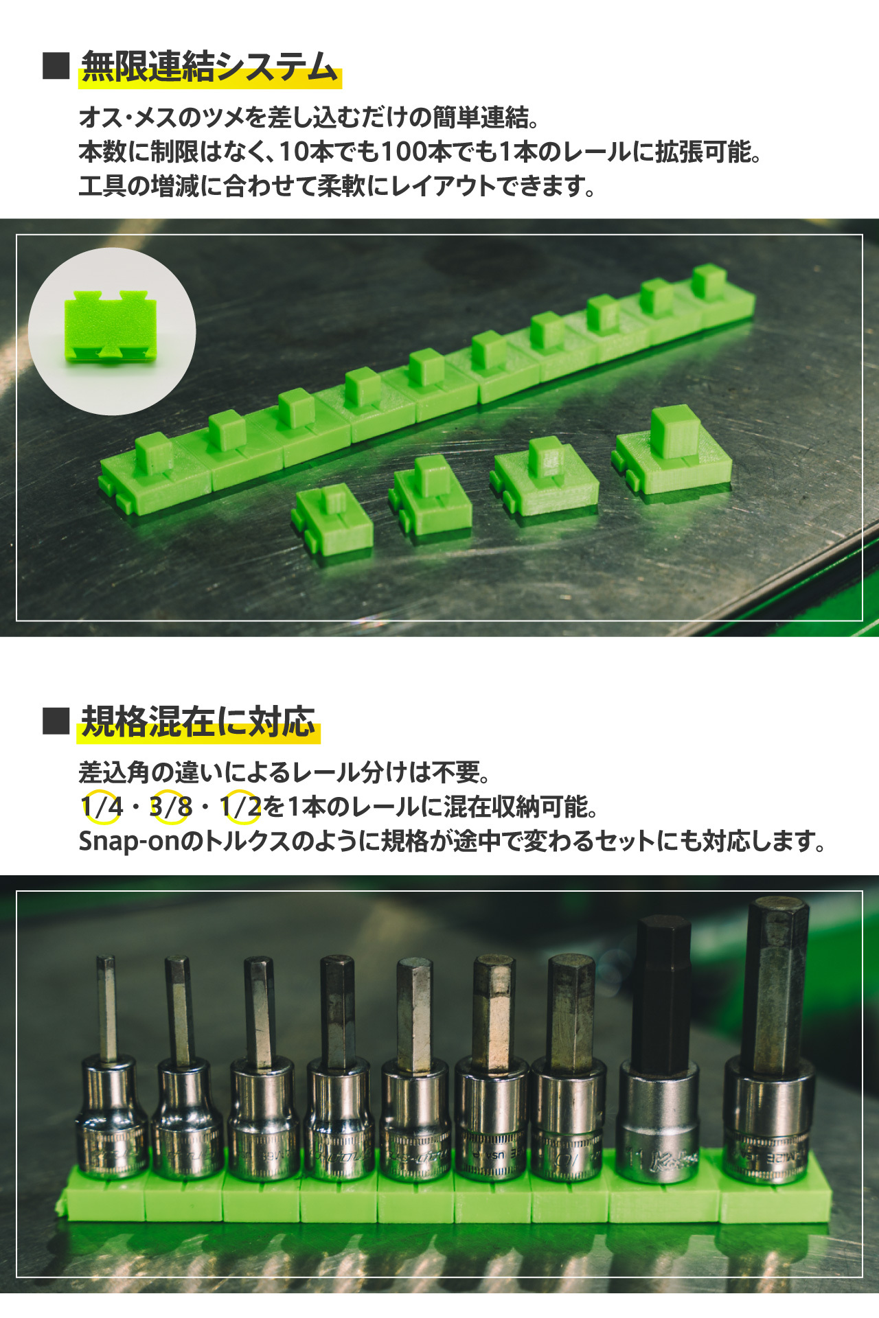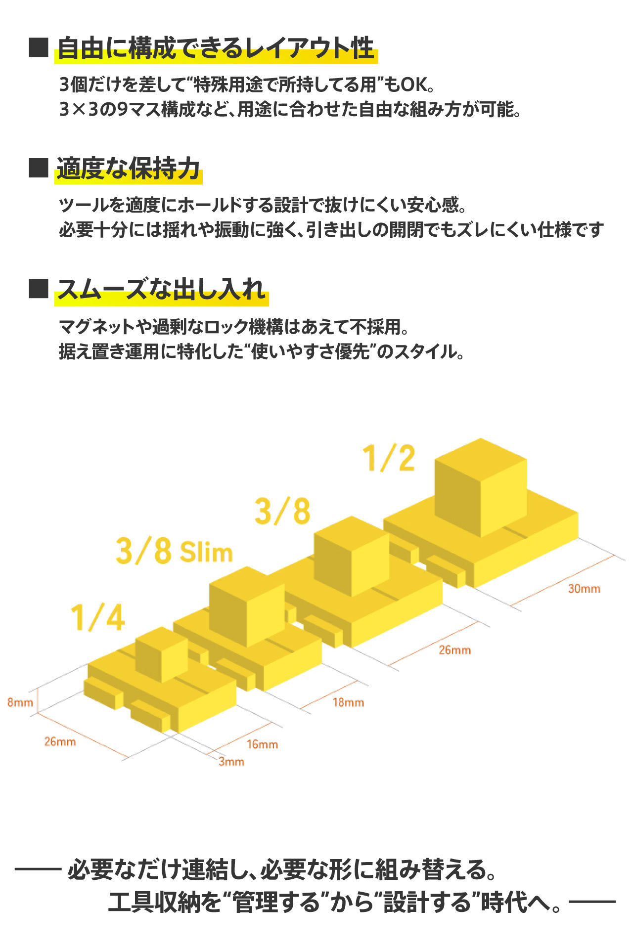 既存のGRID(6cmモジュール)、BASE(トレー型)に続き、RAILは“直線で組み立てる”という新しい整理の形を提供します。