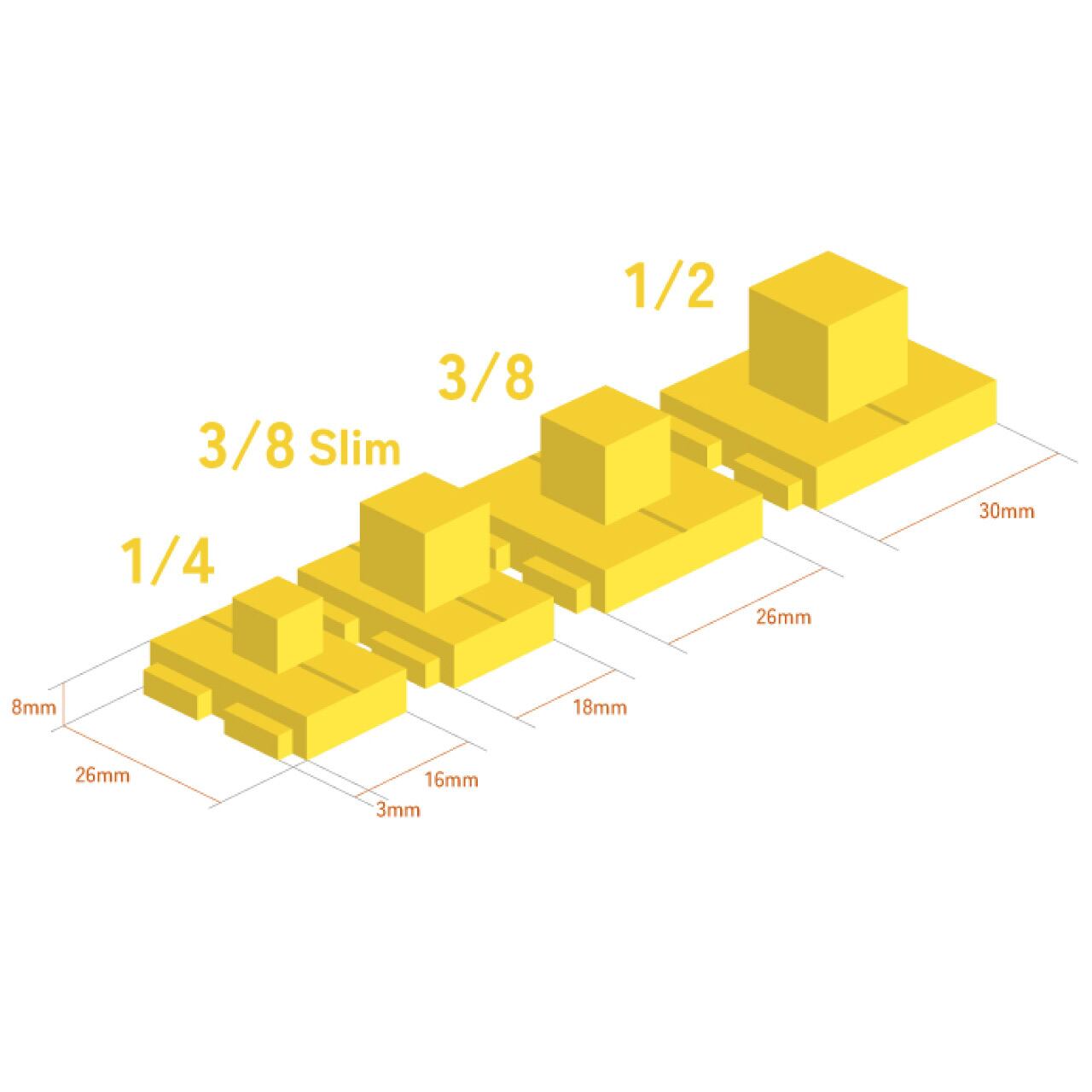 この商品ページは【イエロー4サイズ(1/2、3/8、3/8スリム、1/4)まとめてセット】になります。